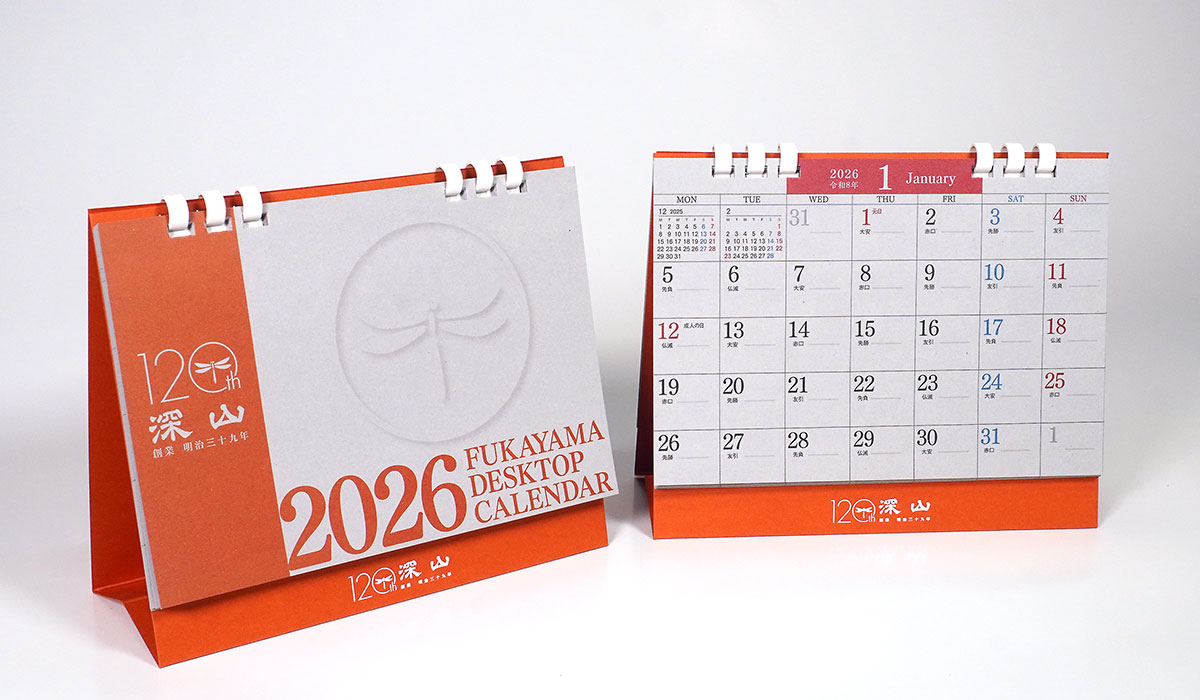 毎年、(株)隆政堂とタッグを組み、様々なコンセプトで制作している紙を扱う私たちの“好奇心”と“チャレンジ”を詰め込んだ深山のノベルティ卓上カレンダー。今年は普段芯材や台紙に使われる「地券紙」を使用、月曜始まり・午前・午後の予定を分けられるライン入り。